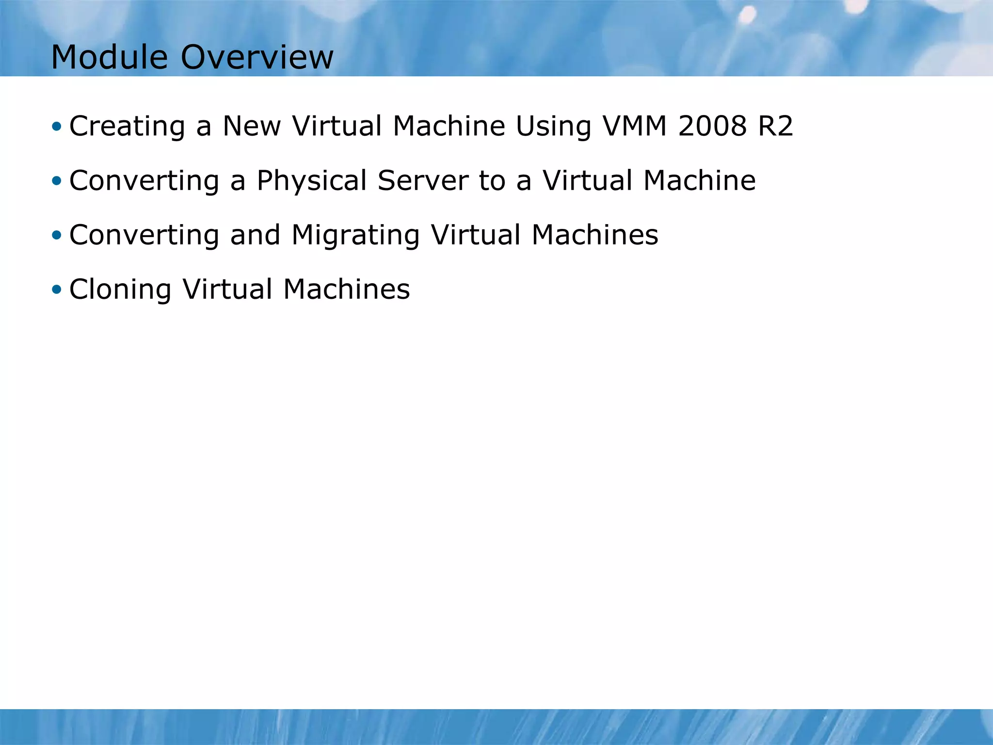 This document discusses creating and managing virtual machines using System Center Virtual Machine Manager 2008 R2. It covers creating new VMs, converting physical servers to VMs, converting and migrating existing VMs, and cloning VMs. Demonstrations show how to create and place new VMs, deploy VMs from a library, perform conversions between VM formats, and migrate VMs between hosts and storage.