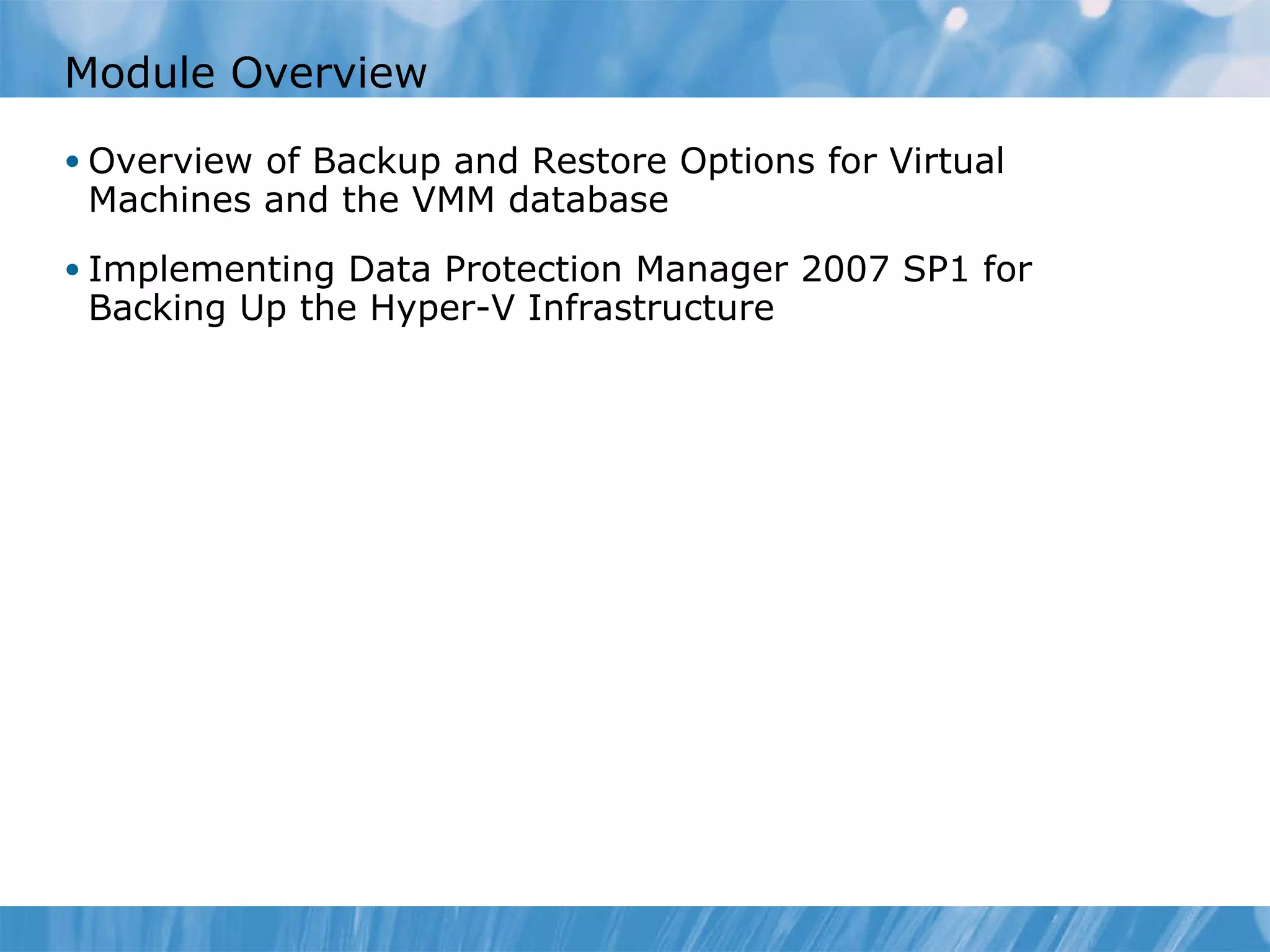 This document provides an overview of backup and restore strategies for virtual machines using various Microsoft technologies. It discusses options for backing up virtual machines and the VMM database using Windows Server Backup, and implementing Data Protection Manager 2007 SP1 to back up the Hyper-V infrastructure. The document includes demonstrations of backing up and restoring virtual machines, the VMM database, and using DPM 2007 SP1 for virtual machine backups.
