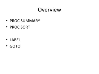 This document provides an overview of the PROC SUMMARY and PROC SORT procedures in SAS. PROC SUMMARY provides tools to compute descriptive statistics across or within groups of observations, similar to PROC MEANS but unable to perform t-tests, confidence limits, or quantiles. PROC SORT orders observations by specified variables. The document also discusses LABEL and GOTO statements, where GOTO directs program execution to a labeled statement and RETURN returns to the beginning, and provides examples of their use.
