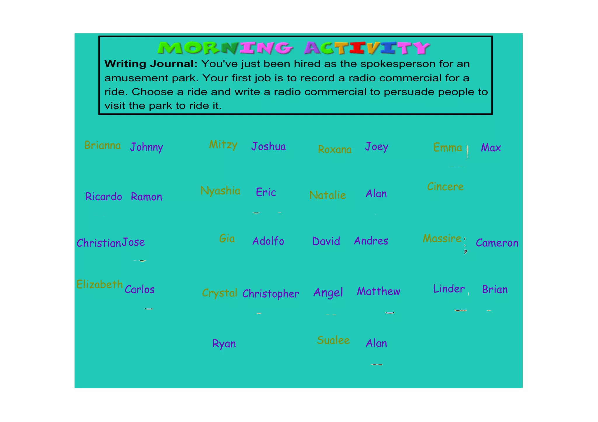 The document provides instructions for a writing assignment to create a radio commercial for an amusement park ride. The assignment asks the student to choose a ride from the park and write a radio commercial to persuade people to visit the park and ride that ride. The summary ends here.
