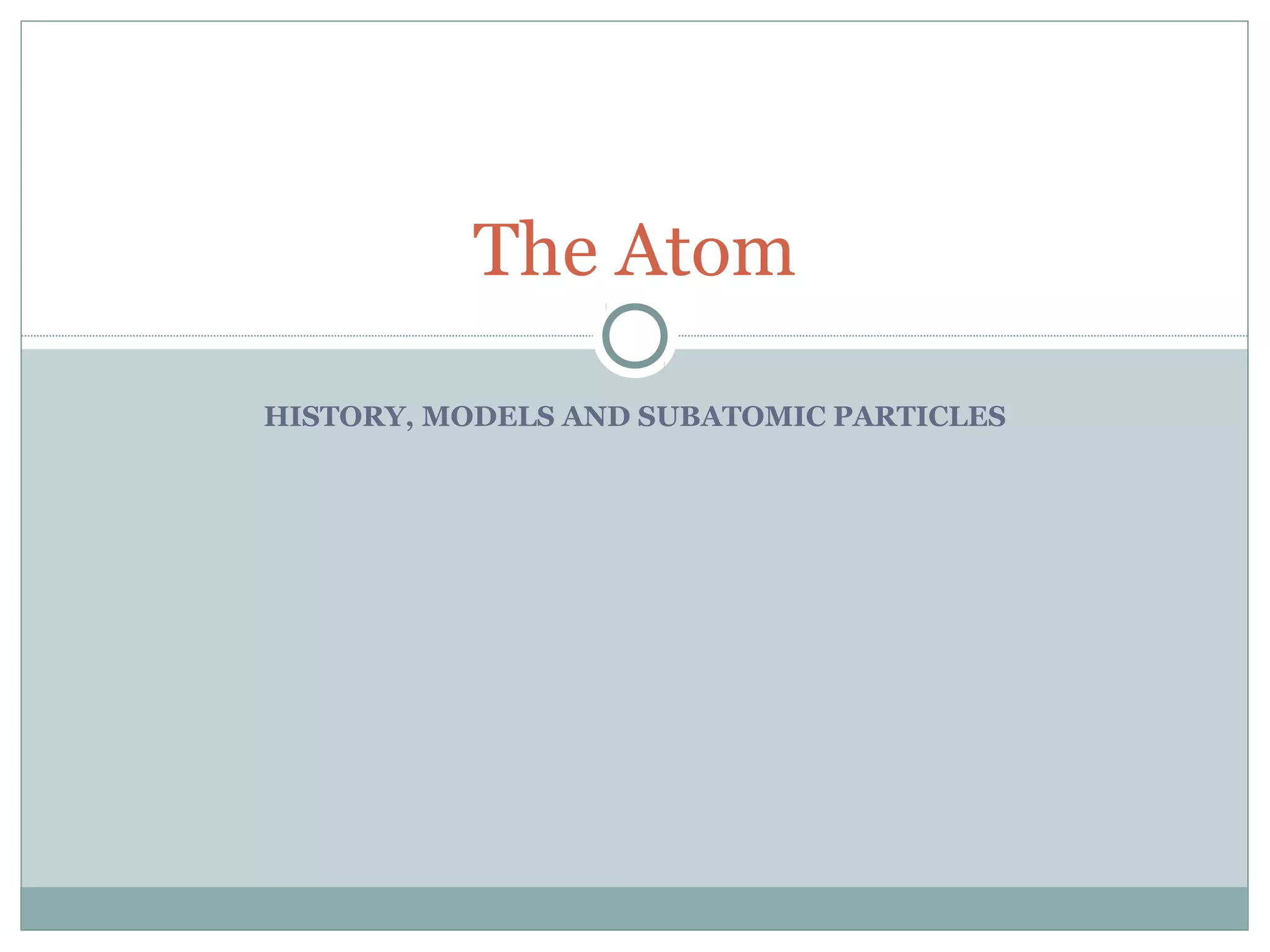 The document discusses the history of atomic theory from ancient Greek philosophers' ideas of "primal matter" to modern atomic structure. It describes early atomic models including Thomson's "plum pudding" model and Rutherford's gold foil experiment. Key developments included Dalton's atomic theory, the discovery of subatomic particles like the electron, proton, and neutron, and the modern nuclear model with electrons orbiting a small, dense, positively-charged nucleus.