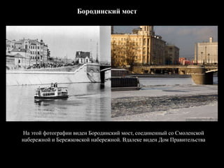 Документ содержит описание исторических и современных объектов в районе Дорогомилово, включая Бородинский мост, станцию метро 'Киевская' и небоскрёбы 'Москва-Сити'. Упоминаются различные архитектурные постройки, их история и значимость, а также планируемые изменения, такие как проект универмага. В тексте также приведены карты, отображающие изменения в районе за века.