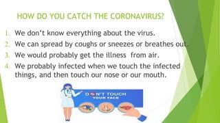 The document provides information about the coronavirus, how it spreads, its symptoms, and recommendations for prevention. It explains that the coronavirus can spread through coughs or sneezes through the air or by touching infected surfaces. While some people may be infected and not feel symptoms, others can experience serious symptoms, especially those over 70 or with poor health. There is currently no cure, but scientists are developing treatments and a potential vaccine. Staying at home is recommended to help prevent the spread until this pandemic is over.