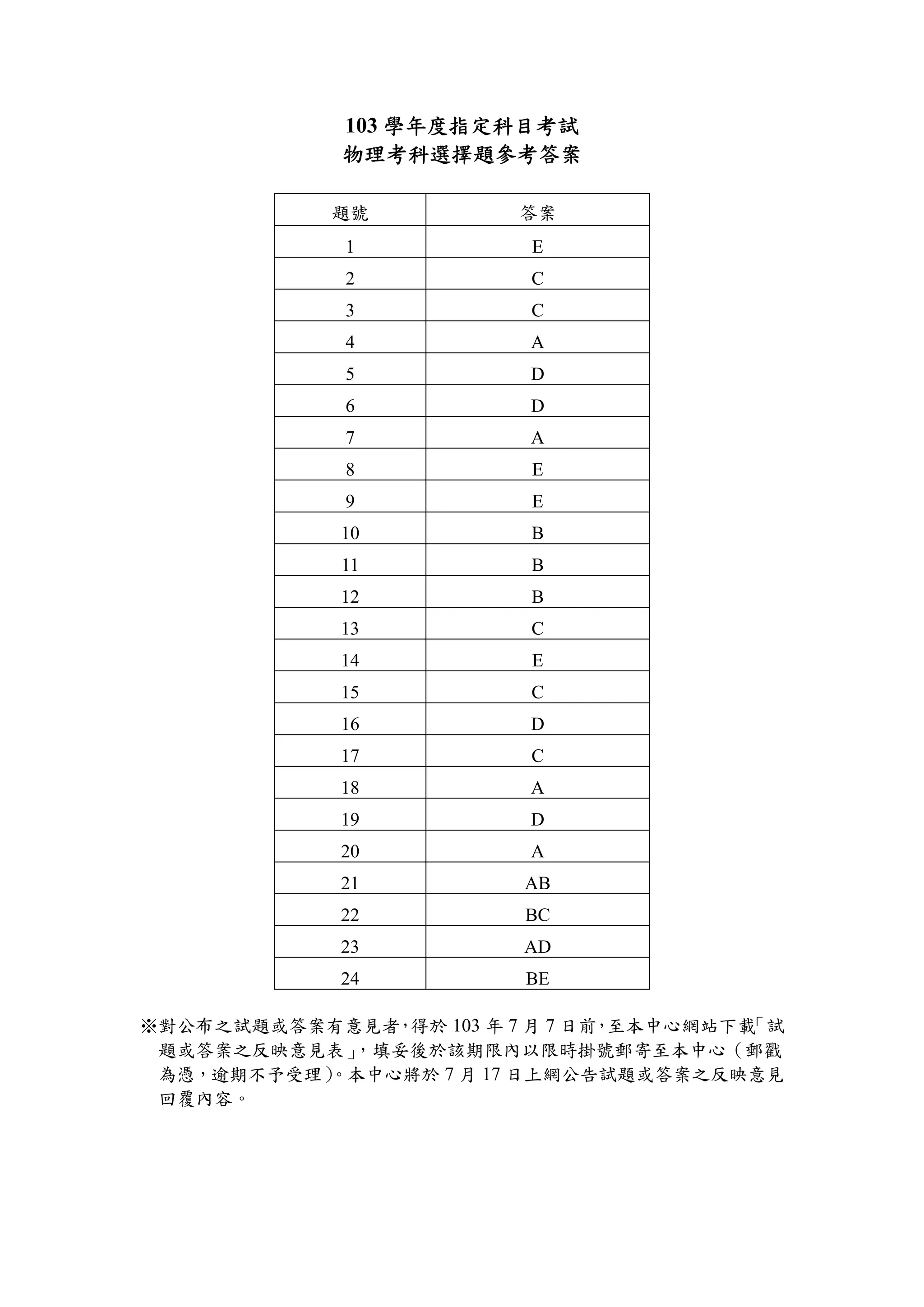 ※對公布之試題或答案有意見者,得於 103 年 7 月 7 日前,至本中心網站下載「試