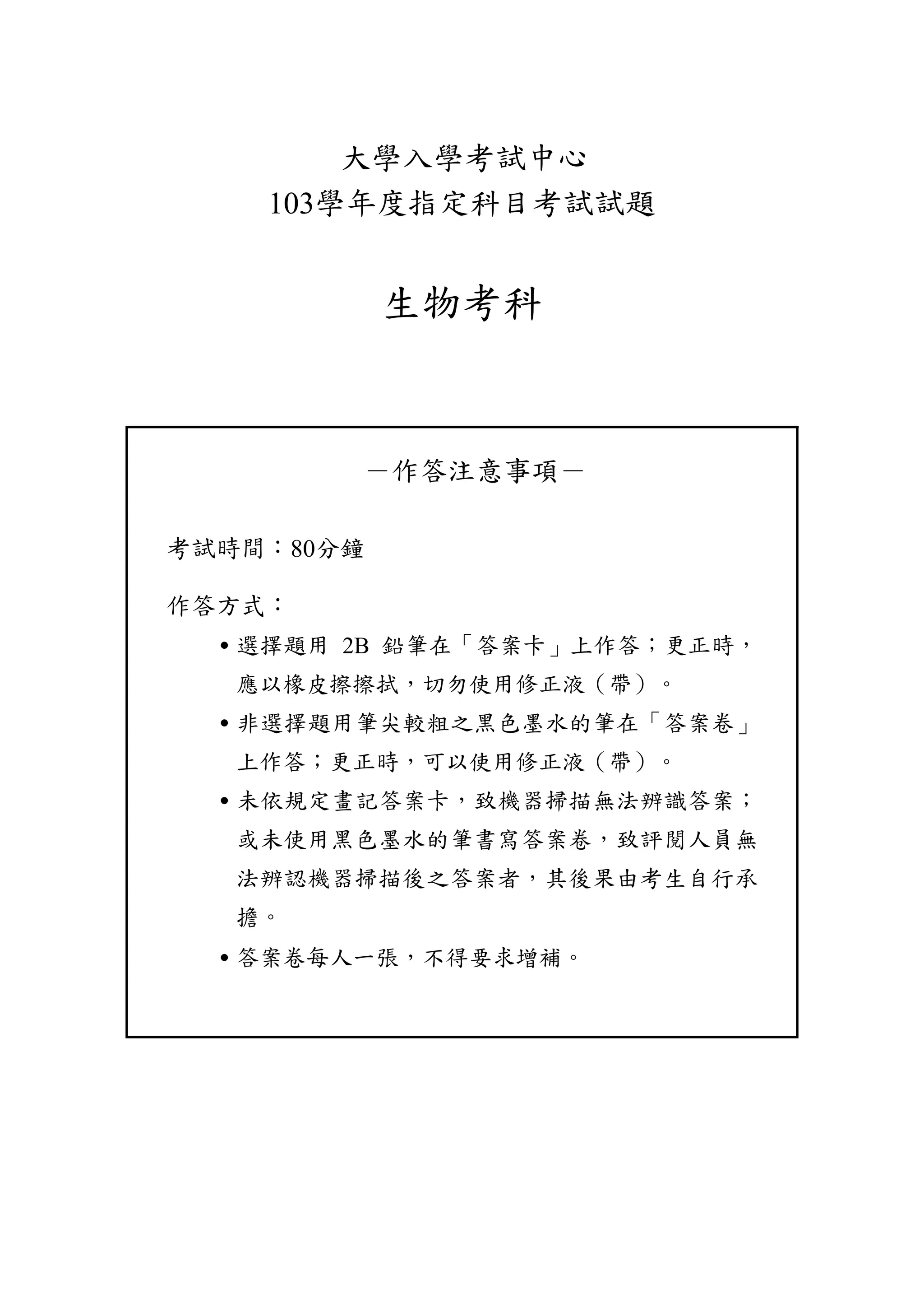 本文件为103学年度大学入学考试中心生物考科的作答注意事项及试题说明。考生需遵循特定的作答方式,确保答案能够被机器识别与评阅,并且文中包含多道生物相关的选择题,涉及激素作用、植物生理、遗传以及生态等主题。考试时间为80分钟,共包含72分的选择题和30分的多选题。