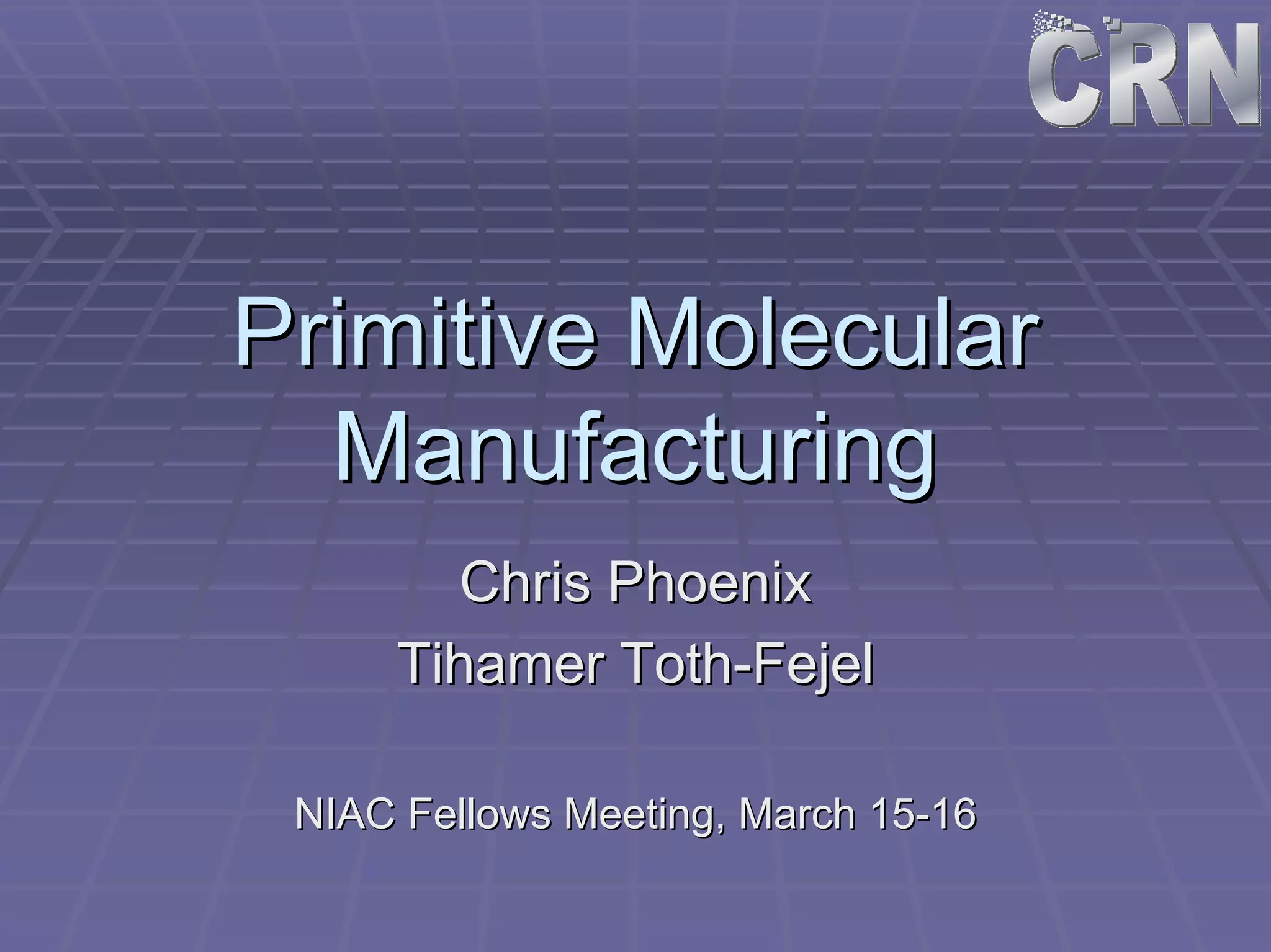 The document discusses the concept of primitive molecular manufacturing using nanoscale tools and techniques. It proposes building precise nanoscale structures through a digital engineering approach involving molecular fabrication, assembly operations, and information handling. The eventual goal is to develop large, high-performance manufacturing tools including a desktop nanofactory capable of producing its own mass in an hour. The presentation outlines some foundational concepts, existing capabilities, and a roadmap for further research.