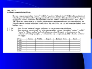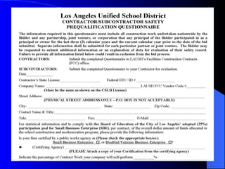 This document summarizes the Los Angeles Unified School District's prequalification process for contractors bidding on both formal and informal district contracts. It outlines the basic requirements, including having a valid contractor's license and workers' compensation insurance. It also describes the prequalification questionnaire contractors must complete, which evaluates their experience, safety history, quality, past performance, financial resources, and more. Contractors are assigned qualification categories based on the level of experience and references they can provide.