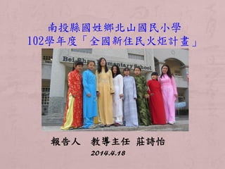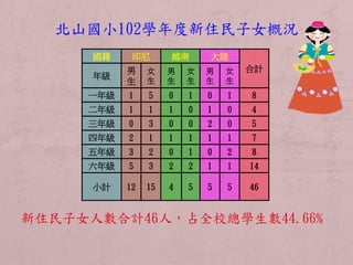 南投縣國姓鄉北山國小報告顯示,102學年度新住民子女占全校學生的44.66%,主要來源於印尼和越南。報告詳細列出推動全國新住民火炬計畫的各項活動及其參與情況,並指出家長參與率低及新住民媽媽的家務負擔。報告中也提出了在新住民家庭訪視和資源採購方面的困難與建議。