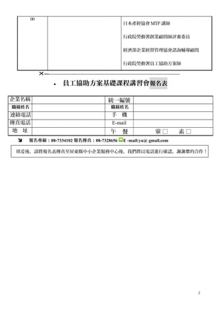 本次員工協助方案基礎課程講習會旨在幫助企業和員工應對職場壓力,促進心理健康,以提高工作效率和企業績效。講習會將於103年07月18日於屏東縣政府舉行,涵蓋員工協助方案的目的、推動方法及案例討論等主題。參加對象包括企業負責人、主管和有興趣人士,報名方式可通過電話或傳真進行。