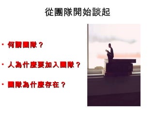 建構團隊裡面可以討論的問題 • 何謂團隊?團隊的基本條件是什麼? • 人和人之間要相處的好,需要怎麼做? •