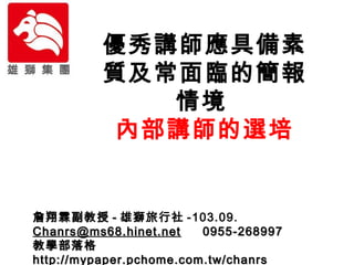 文档探讨了优秀讲师的素质及其在内部培训中的关键角色,强调讲师需要具备丰富的专业知识、良好的表达能力和对教育的热情。内部讲师的选拔和培训不仅能提升公司的培训效果,还能增强企业内部人才的专业能力和管理技能。此外,文档还提出了有效的讲师培训和评估方法,以确保培训质量和学员满意度。