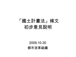 本文件讨论了《国土规划法》的初步意见,包括与现有计划体系的比较、功能区的划分、主管机关的设定以及公众参与和信息公开的建议。此外,还涉及国土保育地区和农业发展地区的发展许可问题,强调了应加强民众参与和透明度。最后,提议参考欧美国家的做法,促进公众参与和信息的公布。