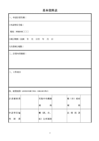 该文档概述了客家委员会推动特色文化产业发展计划的申请流程,包括计划名称、执行时间、执行机构、预算以及实施步骤。文中列举了申请计划的基本信息、预算来源和预期效益,同时还提供了必要的附件和注意事项。总体而言,文档旨在指导和规范客家文化相关计划的申请与实施。