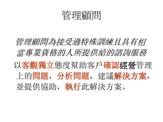 本文件讨论了企业问题分析与诊断的能力提升,重点在于管理顾问如何通过全面分析企业的经营管理状况来识别问题与解决方案。它还概述了管理顾问所需的知识和技能,包括知识创新与系统性思维,同时提供了企业经营诊断的内容与执行步骤。最后,文件探讨了企业创立、成长与稳定阶段的管理辅导方法。