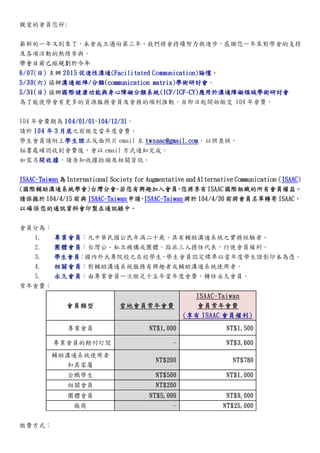 促進性溝通(Facilitated Communication)論壇、 5/30(六) 協辦溝通矩陣/分類(communication matrix)學術研討會、 5/31(日) 協辦國際健康功能與身心障礙分類系統(ICF/ICF-CY)應用於溝通障礙領域學術研討會 為了能使學會有更多的資源服務會員及會務的順利推動,自即日起開始繳交 104 年會費。 104 年會費期為 104/01/01-104/12/31。 請於 104 年 3 月底之前繳交當年度會費。 學生會員請附上學生證正反面照片 email 至 twsaac@gmail.com,以供查核。 秘書處確認收到會費後,會以 email 方式通知完成。 如需另開收據,請告知收據抬頭及相關資訊。 ISAAC-Taiwan 為International Society for Augmentative and Alternative Communication (ISAAC) (國際輔助溝通系統學會)台灣分會,若您有興趣加入會員,您將享有ISAAC國際組織的所有會員權益。 請保握於 104/4/15 前與 ISAAC-Taiwan 申請,ISAAC-Taiwan 將於 104/4/30 前將會員名單轉寄 ISAAC, 以確保您的通訊資料會印製在通訊錄中。 會員分為: 1. 專業會員:凡中華民國公民年滿二十歲、具有輔助溝通系統之實務經驗者。 2. 團體會員:台灣公、私立機構或團體,指派三人擔任代表,行使會員權利。 3. 學生會員:國內外大專院校之在校學生,學生會員認定標準以當年度學生證影印本為憑。 4. 相關會員:對輔助溝通系統服務有興趣者或輔助溝通系統使用者。 5. 永久會員:由專業會員一次繳足十五年當年度會費,轉任永久會員。 常年會費: 會員類型 當地會員常年會費 ISAAC-Taiwan 會員常年會費 (享有 ISAAC 會員權利) 專業會員 NT$1,000 NT$1,500 專業會員的期刊訂閱 - NT$3,600 輔助溝通系統使用者 和其家屬 NT$200 NT$780 全職學生 NT$500 NT$1,000 相關會員 NT$200 團體會員 NT$5,000 NT$9,000 廠商 - NT$25,000 繳費方式: