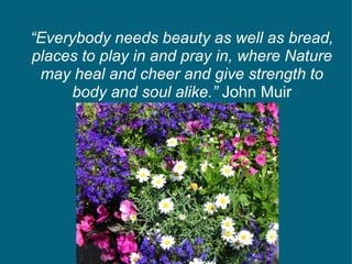 This document discusses how horticultural therapy can help people cope with grief through activities involving plants. Specifically, it describes a topiary project where participants shape ivy plants into symbolic forms using wire. As the plants grow, it provides an opportunity for creative expression and allows people to process their grief by reflecting on their loved one and how their life has changed since losing them. The goal is for the tending of the living memorial to help improve mood and promote positive coping skills during the grieving process.