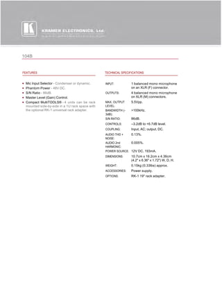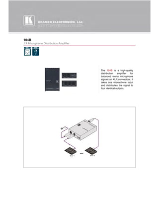 The 104B is a distribution amplifier that takes one microphone input via an XLR connector and distributes the balanced mono signal to four identical outputs through additional XLR connectors. It allows the user to select between condenser or dynamic microphones, provides 48V phantom power, and includes a master level control. The unit is compact and can be rack mounted with an optional adapter.