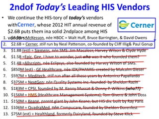 This document provides a summary of the early history of the healthcare IT company Cerner. It describes how Cerner was founded in 1979 by Neal Patterson, Cliff Illig, and Paul Gorup under the name PGI, Inc. It details the educational and professional backgrounds of the three founders. It also discusses some of PGI's early clients in healthcare and how they began focusing on clinical systems, pioneering their PathNet product. The company would later become known as Cerner and grow to be one of the largest healthcare IT vendors.