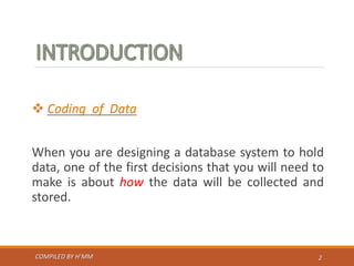 Coding involves assigning abbreviated representations to data values to facilitate more efficient data entry, storage, and retrieval. Some common reasons for coding data include speeding up entry by reducing characters, improving accuracy through validation of allowed code values, and reducing storage needs. However, coding can also coarsening of data precision and potentially obscure meaning if codes are not well documented. Proper documentation of coding schemes is important for users to be able to correctly interpret coded data.