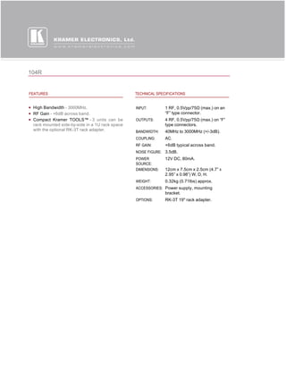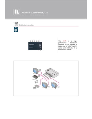 The 104R is a distribution amplifier that takes one RF input signal and distributes it to four identical outputs. It has a high bandwidth of 3000MHz, an RF gain of +6dB across the band, and can be rack mounted in a 1U rack space alongside two other units using an optional rack adapter. The 104R provides RF distribution with technical specifications including an input of 0.5Vpp/75Ω, outputs of 0.5Vpp/75Ω, and a bandwidth of 40MHz to 3000MHz (+/-3dB).