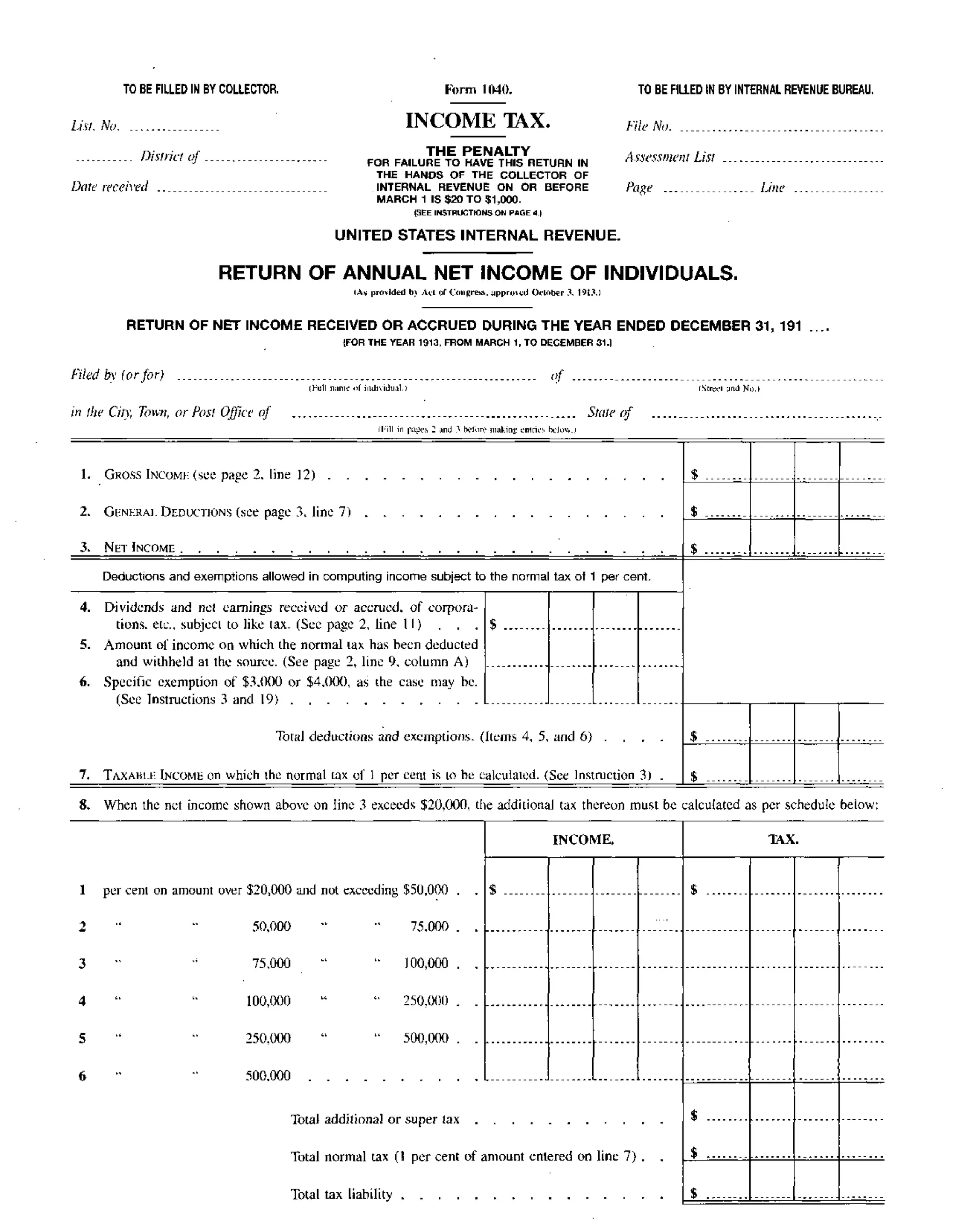 This document is an early 20th century U.S. federal income tax form (Form 1040) from 1913. It contains instructions for reporting various types of individual income, deductions, exemptions, and calculating the tax owed. Key details include reporting gross income, dividends, deductions for expenses, taxes paid, losses, and worthless debts. The form must be filed by March 1st to avoid penalties and includes an affidavit certifying the accuracy of the reported information.