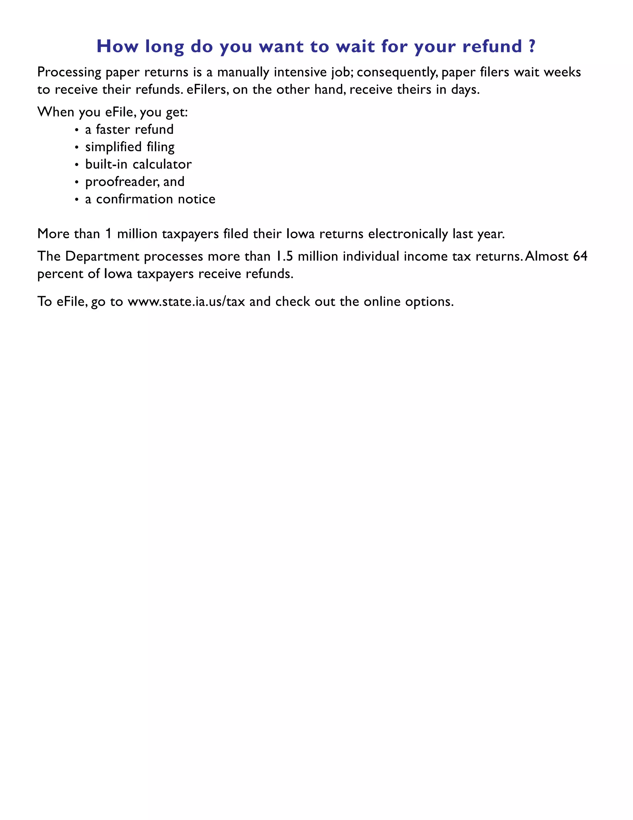 This document provides instructions for filing an Iowa individual income tax return electronically (eFiling). It states that eFilers receive refunds faster than paper filers, within days rather than weeks. Benefits of eFiling include a faster refund, simplified filing process, built-in calculators, proofreading, and confirmation of filing. Over 1 million taxpayers eFiled their Iowa returns last year, representing almost 64% of taxpayers who received refunds on average. To eFile your Iowa tax return, visit the state's website listed at the end.