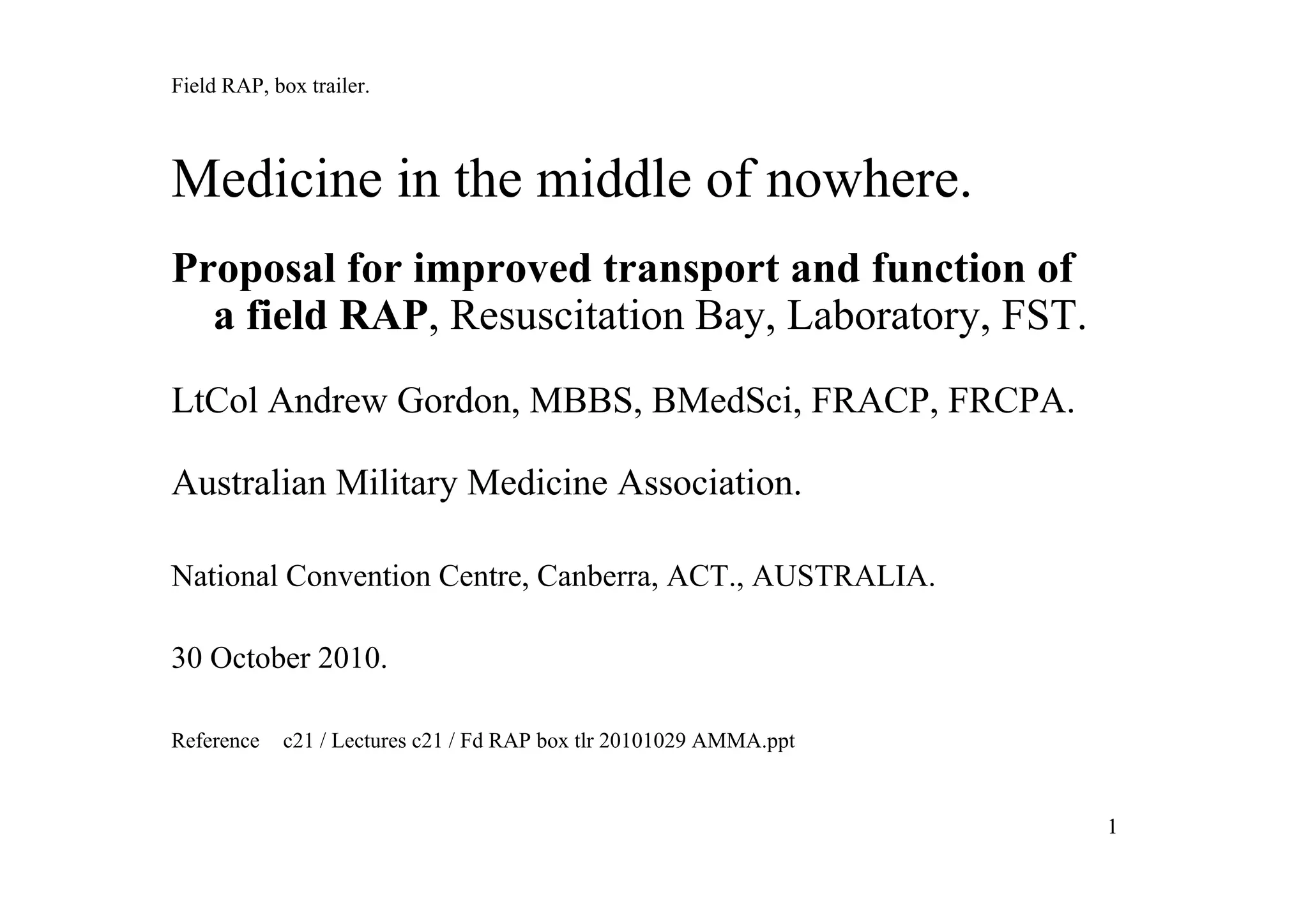 LtCol Andrew Gordon proposes an improved field Resuscitation and Assessment Post (RAP) based on a box trailer. The RAP-mobile aims to be more mobile, require less time from required care to starting patient care, involve less double handling, be air portable, independent, flexible, simple, and conform to military medical doctrine. It is designed with practical loading, priorities of medical equipment, and considerations for air transport and casualty handling. The RAP-mobile has undergone engineering improvements and is ready for field testing, with the goal of developing a standardized, logistically sound mobile field medical unit.