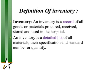 This document discusses inventory control and condemnation procedures in hospitals. It defines inventory as a record of all goods and materials procured, received, stored, and used. Maintaining accurate inventories has several purposes, including checking materials against standards, disposing of excess items, and identifying losses or damage. The document outlines different inventory methods like perpetual, ABC, and two-bin systems. It also covers procedures for condemning expired or obsolete items, such as forming a committee to inspect items and make disposal recommendations.