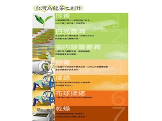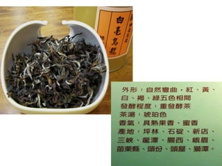 该文档讨论了茶的冲泡方法、茶道的内涵和茶叶的发酵过程,强调了茶艺与茶道的区别,以及台湾地区不同茶类的发展历史。特别提到文山包种茶和高山茶的特征与种植条件,同时也分析了红茶的品质标准和健康益处。整体内容丰富,呈现了茶文化的深厚底蕴与实际操作技巧。