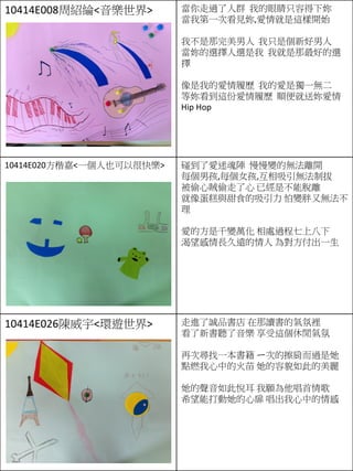 该文档包含多首关于爱情、情感和人与人之间关系的诗歌和歌词,每首作品展示了不同的视角和情感体验。主题涉及初恋、告白、孤独和对未来的期待,表达了对爱的渴望和对生命的感悟。整体上,这些作品传达了爱情的复杂性和美好。