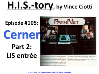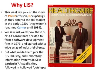 This document summarizes the early history of Cerner, formerly known as PGI. It discusses how PGI entered the healthcare IT market in the early 1980s by developing a laboratory information system (LIS) called PathNet. PGI was able to win its first contract with St. John Medical Center in Tulsa by automating their entire lab operations with PathNet. PathNet was then implemented at three other pilot sites. This success allowed PGI to raise venture capital and begin competing with established LIS vendors at the time like Spear, BSL, and MedLab. By 1988, PGI, now known as Cerner, had grown to 72 LIS sales, ranking them 9th among LIS vendors.