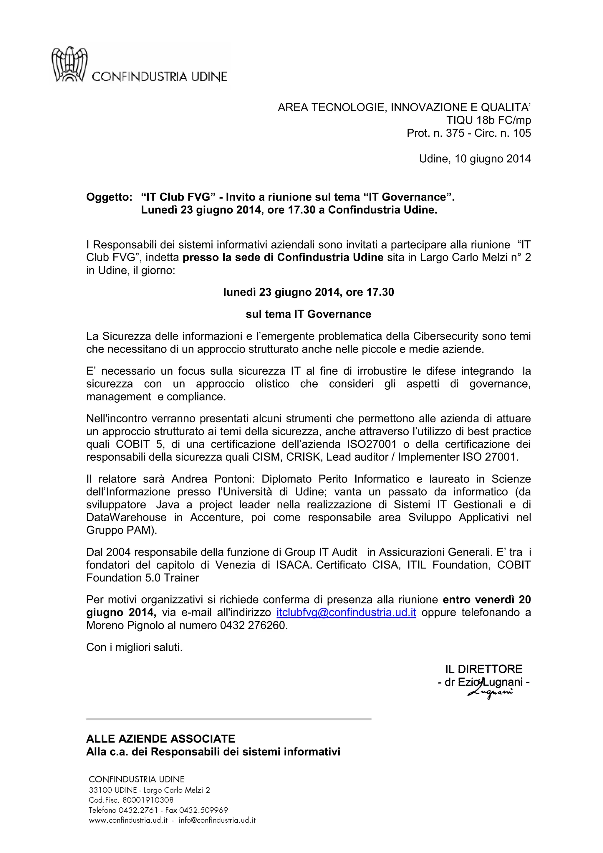 L'incontro dell'IT Club FVG si svolgerà il 23 giugno 2014 presso Confindustria Udine, con focus sulla governance IT e cybersecurity per piccole e medie imprese. Saranno presentati strumenti e best practice come COBIT 5 e certificazioni ISO27001. La partecipazione deve essere confermata entro il 20 giugno 2014.