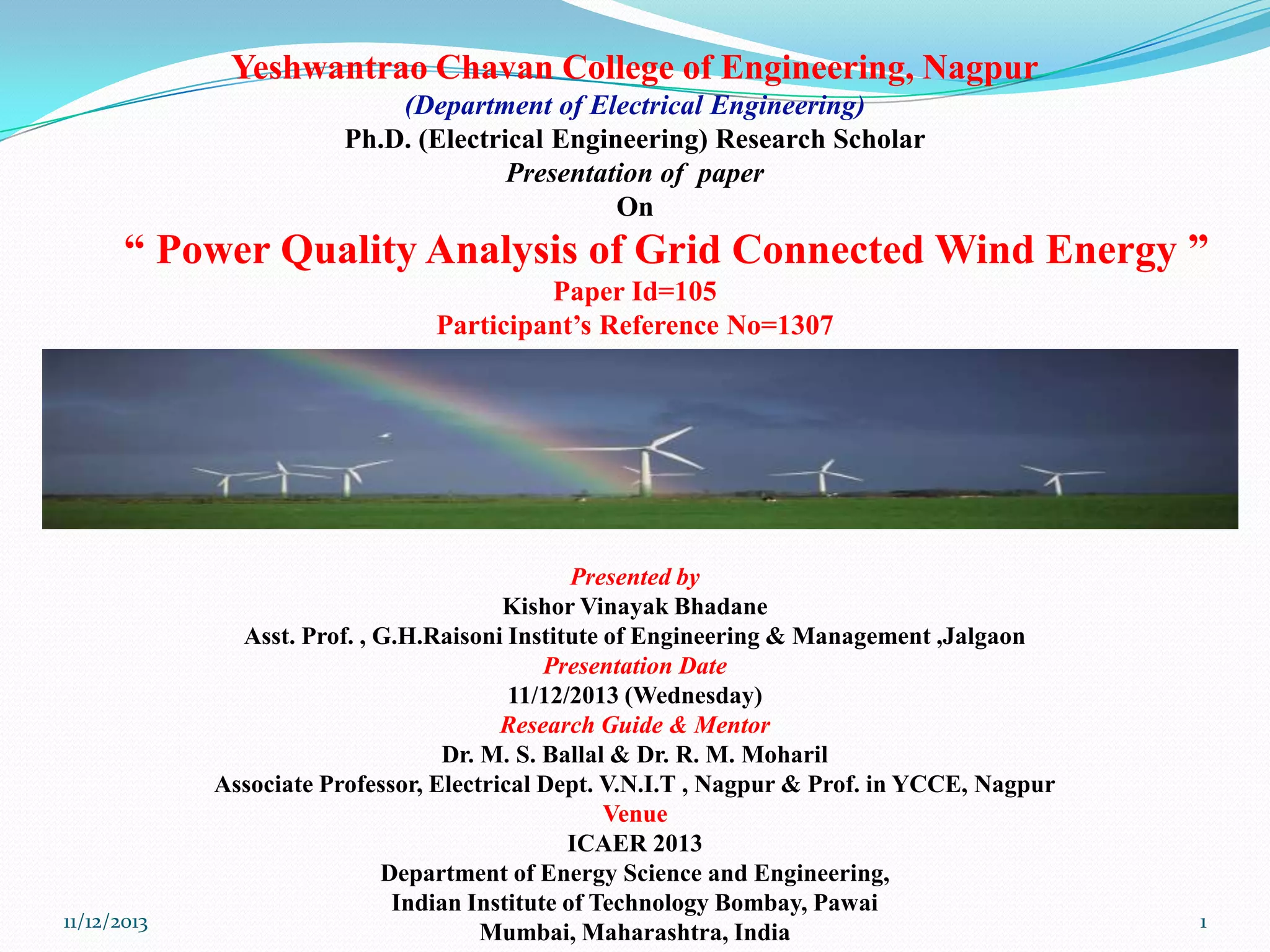 The document presents a paper on power quality analysis of a grid-connected wind farm. It discusses modeling and simulating the wind farm using MATLAB/Simulink. It shows simulations of the wind farm under normal operation and during events like voltage sags and swells. Data from the simulations investigating current, voltage, power and power quality are presented. The conclusions state that power quality issues for high-penetration grid-connected wind farms have been investigated through modeling and simulations in MATLAB/Simulink.