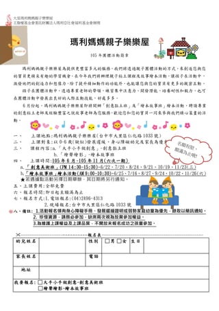 瑪利媽媽親子樂樂屋將於105年舉辦親子團體活動,包括創意黏土班及繪本故事班,旨在提升兒童的創造力和人際互動技能。活動對象為0-6歲發展遲緩或身心障礙幼兒及其家長,全部免費,並優先錄取持有相關證明的家庭。報名方式包括電話和現場報名,名額有限,缺席兩次將視為放棄參加權益。