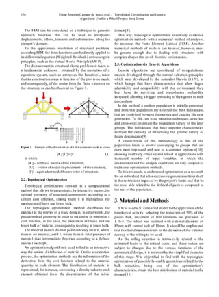 This document summarizes a study that used topological optimization and genetic algorithms to analyze and optimize the design of wheels for an unmanned aerial vehicle (UAV). The study used finite element analysis software to conduct topological optimization on a simplified 2D model of a wheel. The goal was to reduce the wheel's mass by 50% while maintaining structural integrity. Genetic algorithms from other optimization software were also utilized. The optimized wheel design reduced mass by 40% compared to previous designs. The study found that wheel width had the greatest influence on the aircraft's mechanical performance.
