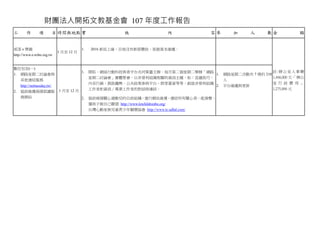 財團法人開拓文教基金會在107年度進行多項工作,包括協助非營利組織訓練和資源提供、維護資訊救災平台及身心障礙者服務資訊網,並針對數位包容進行相關活動,共計吸引各界參與者。報告涵蓋了各項目實施內容、參加人數和經費使用情況,推動社會議題如性別平等、身心障礙權益等。此次工作報告強調了非營利組織在推動社會變革中的重要性。