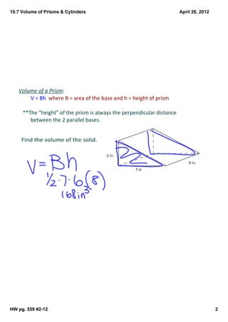 This document discusses the formulas for calculating the volume of prisms and cylinders. For prisms, volume is calculated as V = Bh, where B is the area of the base and h is the height measured perpendicular to the bases. For cylinders, volume is calculated as V = πr^2h, where r is the radius of the circular base and h is the height. Examples of prisms and cylinders with measurements are provided to demonstrate how to apply the volume formulas.