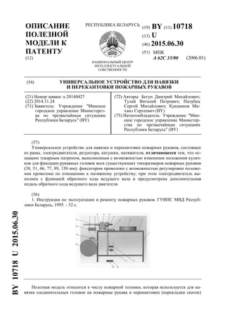 Документ описывает полезную модель универсального устройства для навязки и перекантовки пожарных рукавов, разработанную для улучшения работы с различными типоразмерами рукавов. Устройство включает в себя раму, электродвигатель, редуктор, катушку и натяжитель, с возможностью регулировки положения кулачков и проволоки. Эта модель создана для оптимизации процесса навязки и сокращения времени на выполнение операций с пожарными рукавами.