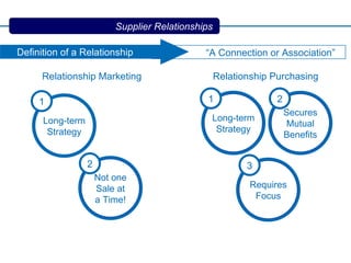 IBM would likely develop long-term, collaborative relationships with Keytronic focused on mutual benefits rather than individual transactions. Relationship purchasing requires focus on supplier retention through close cooperation and information sharing to improve factors like price, quality, and delivery. These types of relationships are useful as they allow IBM and Keytronic to work together innovatively as partners to achieve their goals.