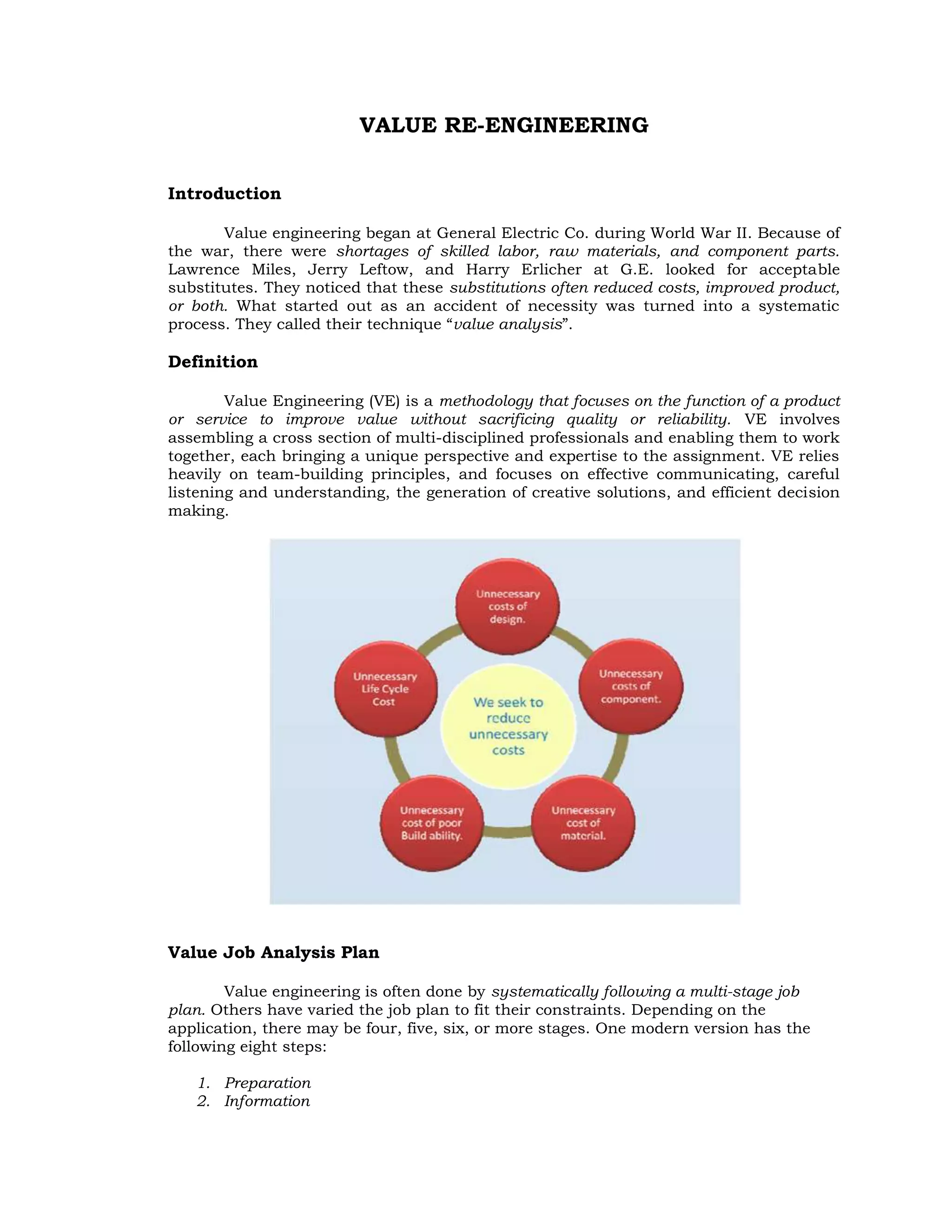 Value engineering began at GE during WWII due to shortages and looked for acceptable substitutes, often reducing costs and improving products. It became a systematic process called value analysis. Value engineering is a methodology that focuses on a product's function to improve value without sacrificing quality by assembling a cross-functional team. It relies on team building, communication, and efficient decision making. Value engineering follows a multi-stage job plan including information gathering, alternative generation, evaluation, and presentation to determine the best alternative. Benefits include lowering costs, improving efficiency and competitiveness.