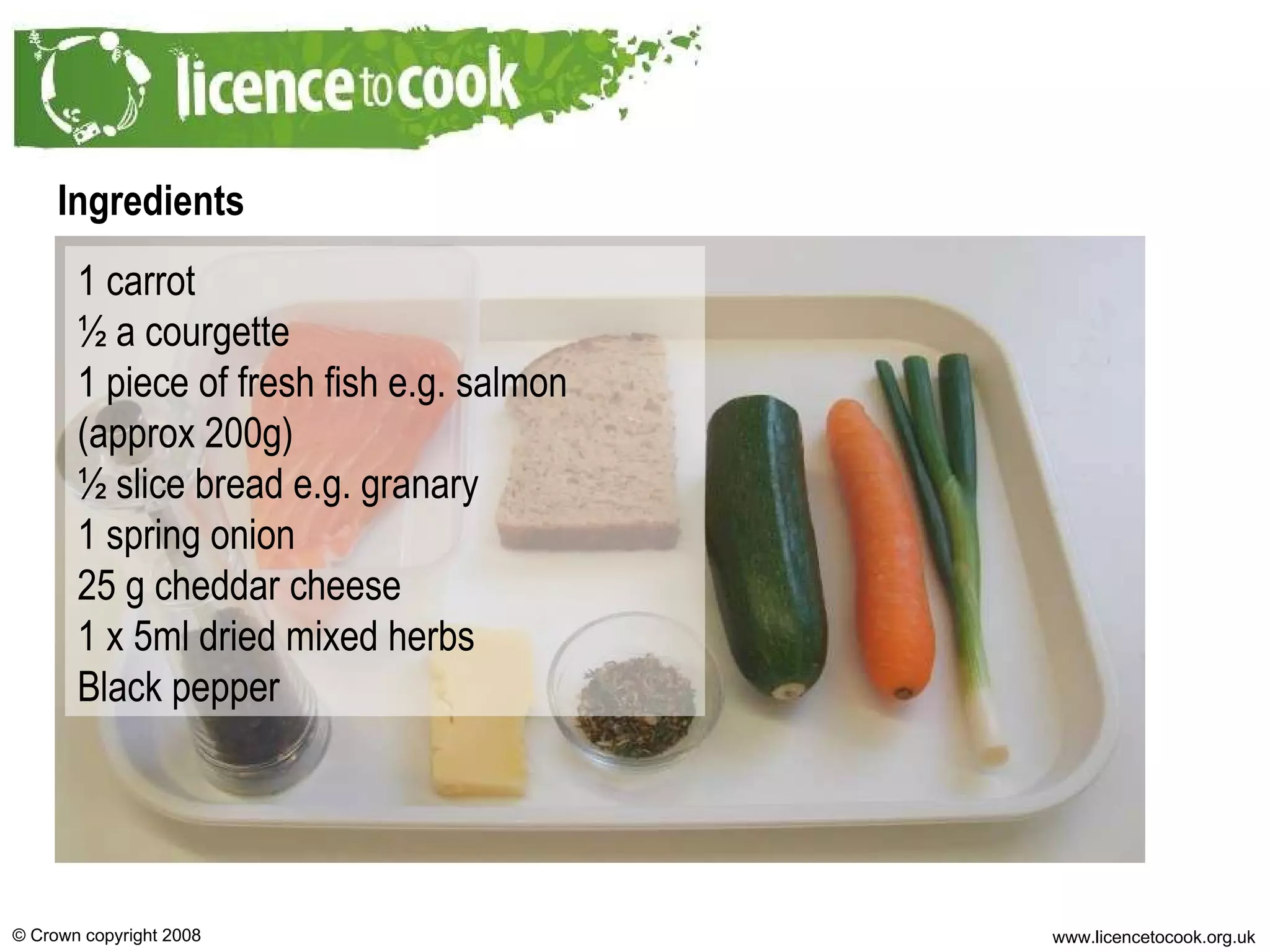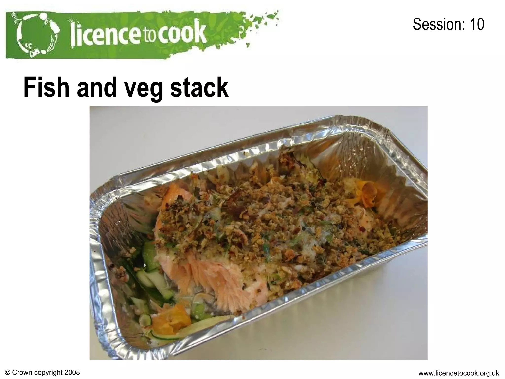 This document provides a recipe for a fish and vegetable stack that can be baked in the oven. It calls for layering carrot and courgette ribbons in a dish, topping with a piece of salmon and grated cheese, then mixing breadcrumbs, spring onion, cheese and herbs to spoon over the top. The stacked dish is then baked for 20 minutes before serving. The recipe encourages variations and using pasta or rice with the vegetables to make it a complete meal.
