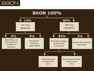 Документ описывает стратегию компании baon по созданию единой клиентской базы для повышения лояльности покупателей и увеличения продаж через мультиканальные подходы. Основное внимание уделяется интеграции интернет- и розничных продаж, внедрению скидочных карт, а также преимуществам онлайн и оффлайн покупок. Также рассматриваются методы удержания клиентов и повышение их лояльности с помощью качественного сервиса и персонализированного подхода.