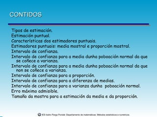 Estimadores puntuais: media mostral e proporción mostral.