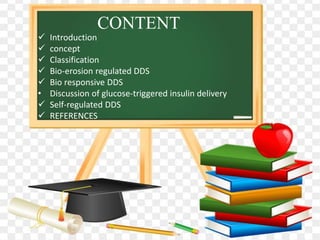 This document discusses different types of feedback regulated drug delivery systems (FR-DDS). It introduces bio-erosion regulated DDS, bio-responsive DDS, and self-regulated DDS. For bio-erosion regulated DDS, the system consists of a drug dispersed in a bio-erodible matrix. In the presence of urea, the polymer matrix degrades rapidly, releasing the drug. For bio-responsive DDS, the drug reservoir is enclosed in a membrane whose permeability is controlled by the concentration of a biochemical agent like glucose. For self-regulated DDS, the drug is coupled to a sugar and encapsulated in a complex with a lectin protein. Glucose competes for binding sites