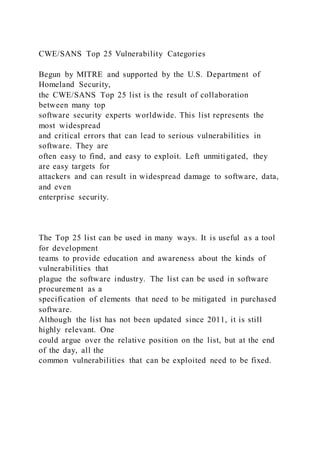 This document discusses common software vulnerabilities and provides examples of different types of attacks such as SQL injection, command injection, integer overflow, path traversal, cross-site scripting, cross-site request forgery, and cryptographic failures. It examines the CWE/SANS top 25 list of vulnerabilities and the OWASP top 10 list of web application vulnerabilities. Specific vulnerabilities like SQL injection, command injection, and integer overflow are explained in more detail with examples of how each attack works and potential mitigations.