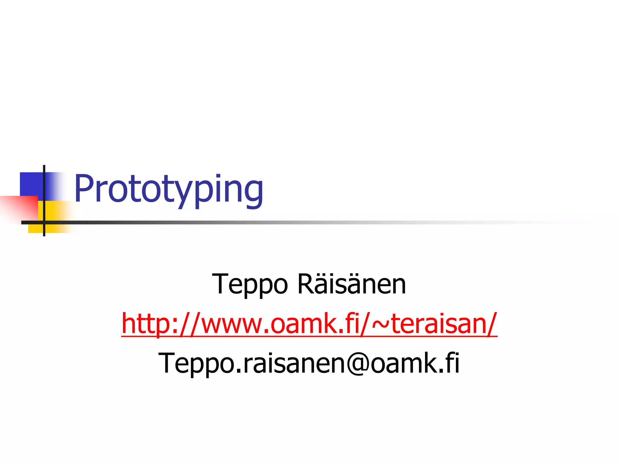 This document discusses different types of prototypes that can be used during product development. It describes paper prototypes as being easy, fast and cheap to produce. Functional prototypes implement some or all features to test functionality but cut costs by reducing features, functionality or resources. Simulation mimics a product's actual user interface while emulation imitates functions on different hardware. The document advises that after testing, prototypes should be discarded rather than having their code used in the final product.