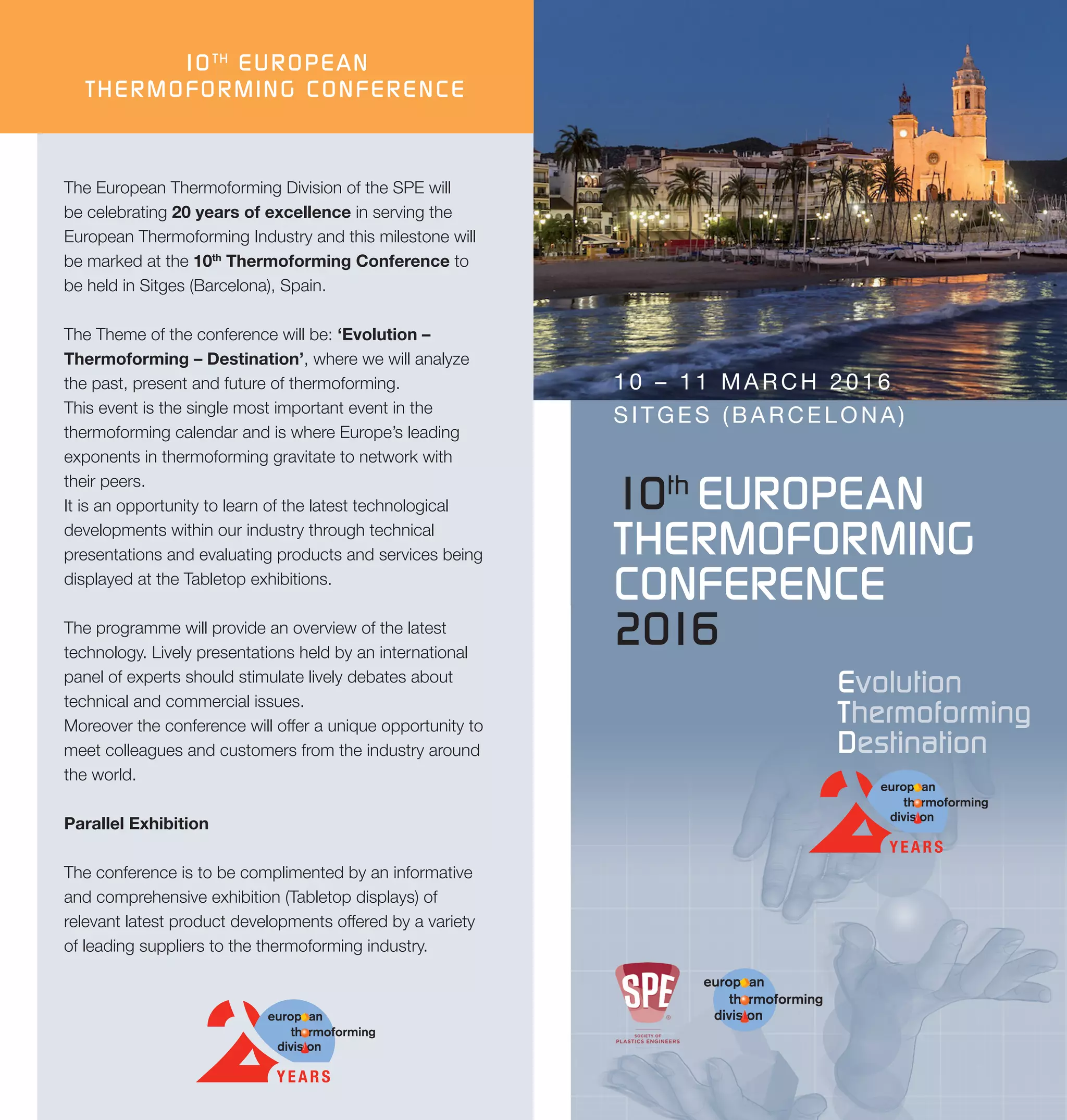 The 10th European Thermoforming Conference will be held on March 10-11, 2016, in Sitges, Spain, celebrating 20 years of the European Thermoforming Division of the SPE. The conference will explore the evolution of thermoforming, featuring technical presentations, networking opportunities, and an exhibition of the latest industry developments. Topics will include recycling, 3D developments, and market trends, with sessions led by international experts and opportunities for professional collaboration.