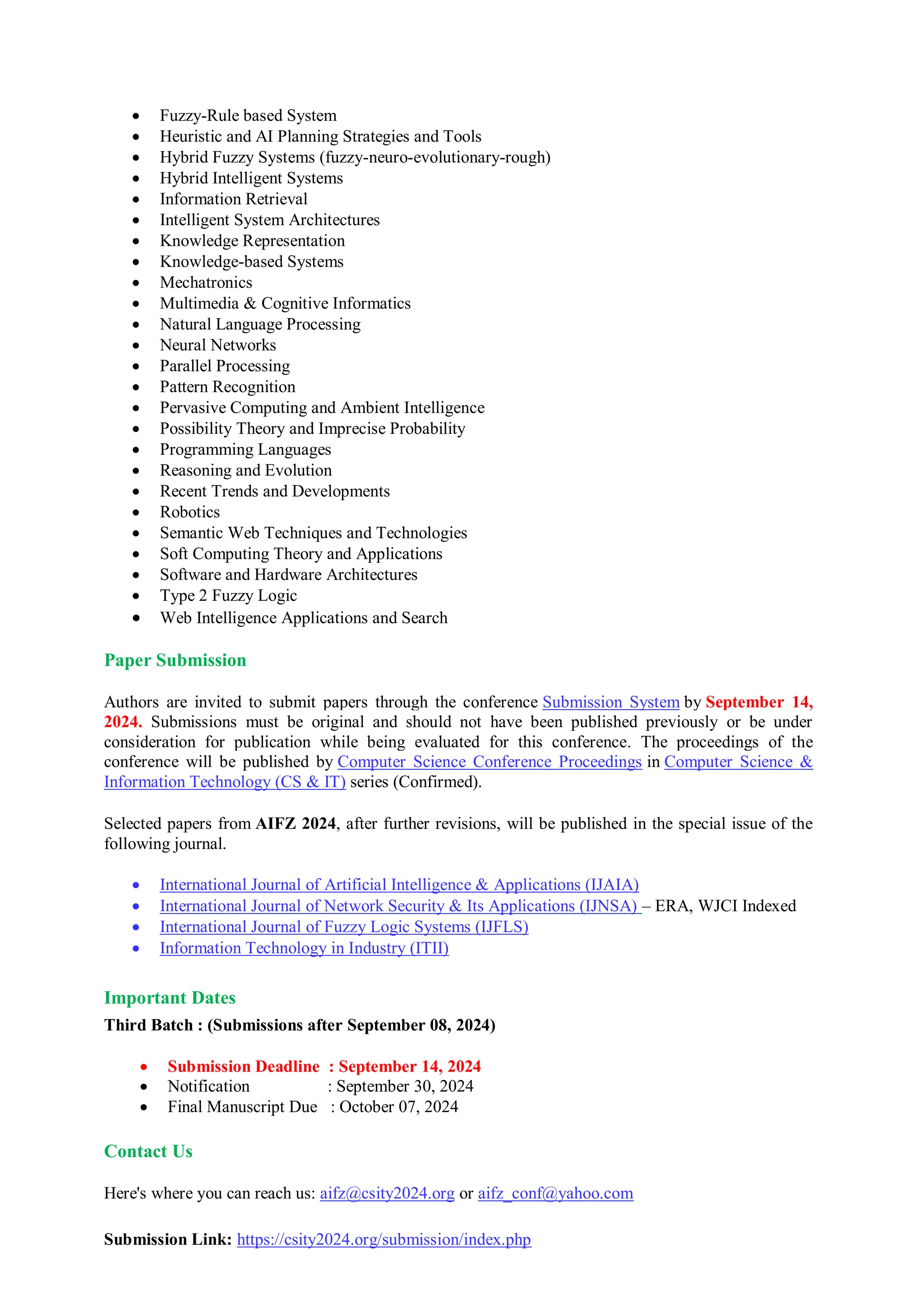 The 10th International Conference on Artificial Intelligence and Fuzzy Logic Systems (AIFZ 2024) will take place in Sydney, Australia on October 19-20, 2024, focusing on advances in AI and fuzzy logic. Authors are invited to submit original research papers by September 14, 2024, covering diverse topics such as AI algorithms, machine learning, and fuzzy systems applications. Selected papers will be published in various journals after further revisions.