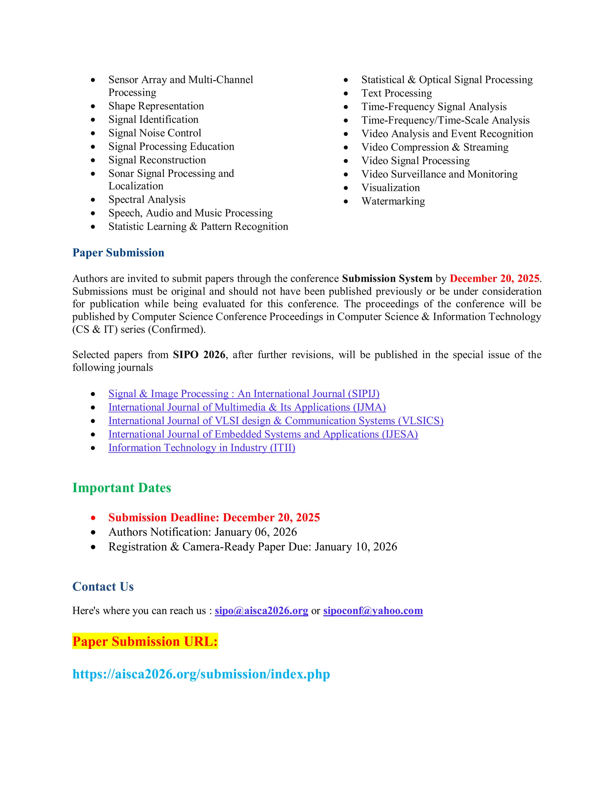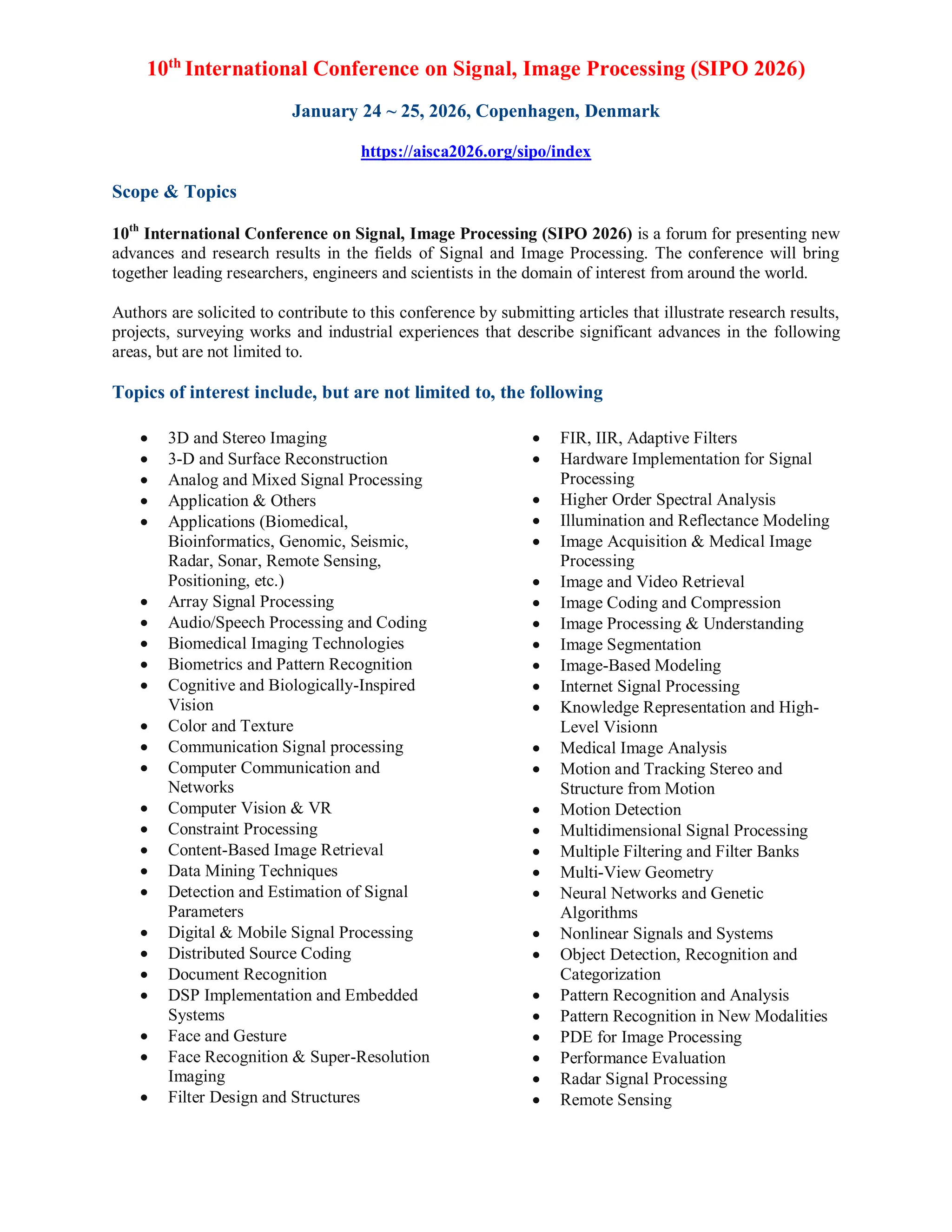 10th International Conference on Signal, Image Processing (SIPO 2026) is a forum for presenting new