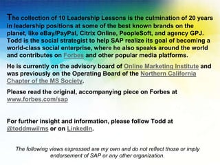 Todd Wilms shares 10 leadership lessons he has learned over 20 years in leadership positions at major companies. The lessons include focusing on long-term strategy rather than short-term gains, prioritizing building trust over titles, and understanding that leadership is defined by how you handle failures as well as successes. Wilms draws on his experience at companies like eBay/PayPal, Citrix Online, and PeopleSoft to offer advice for developing leadership skills.